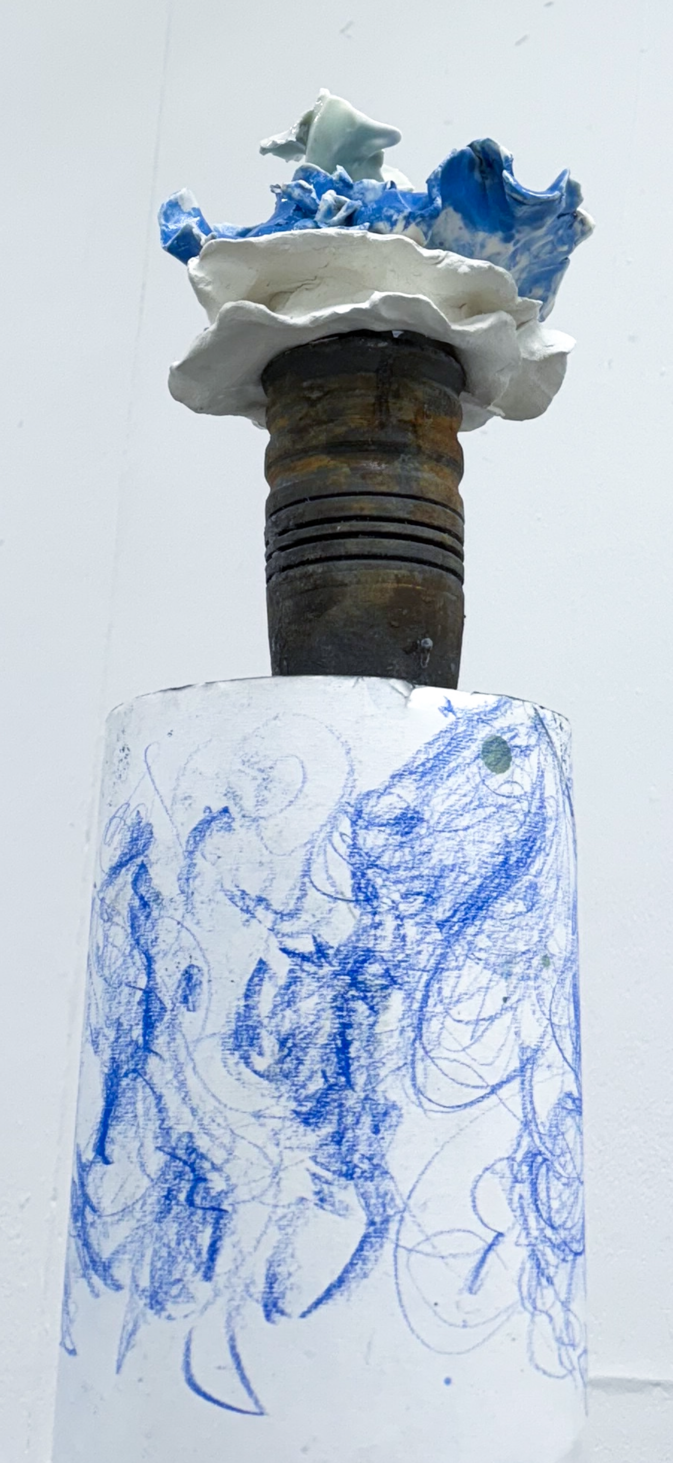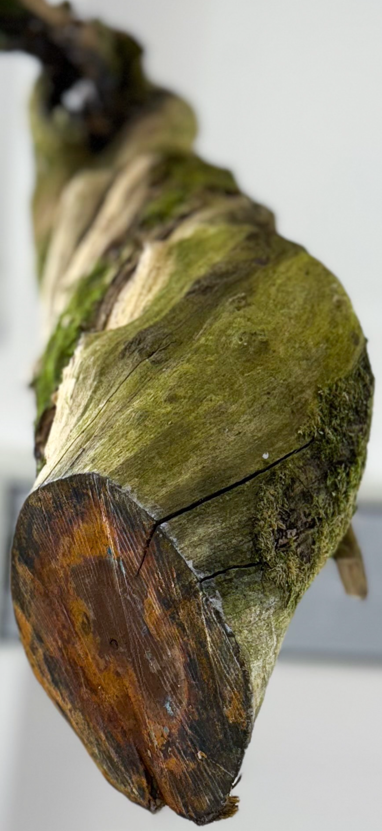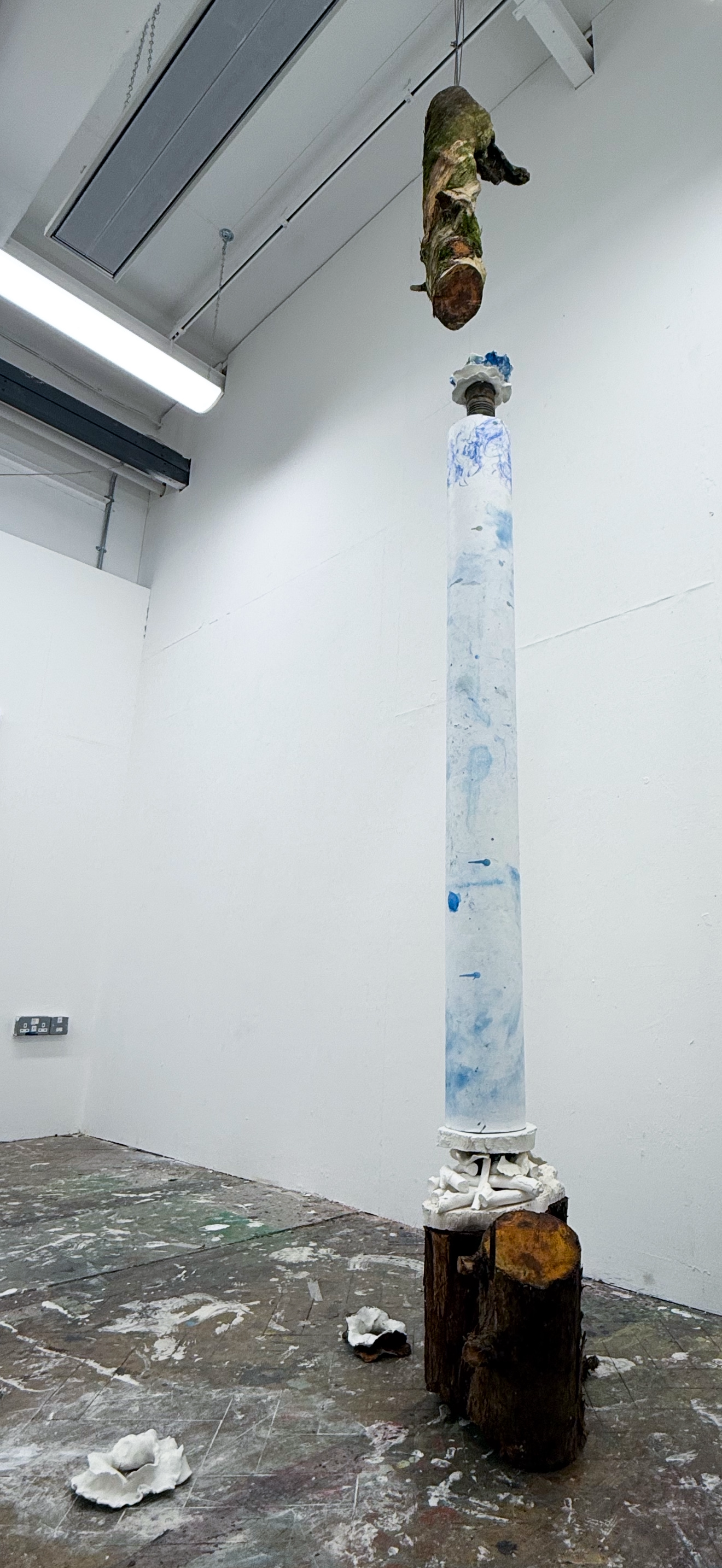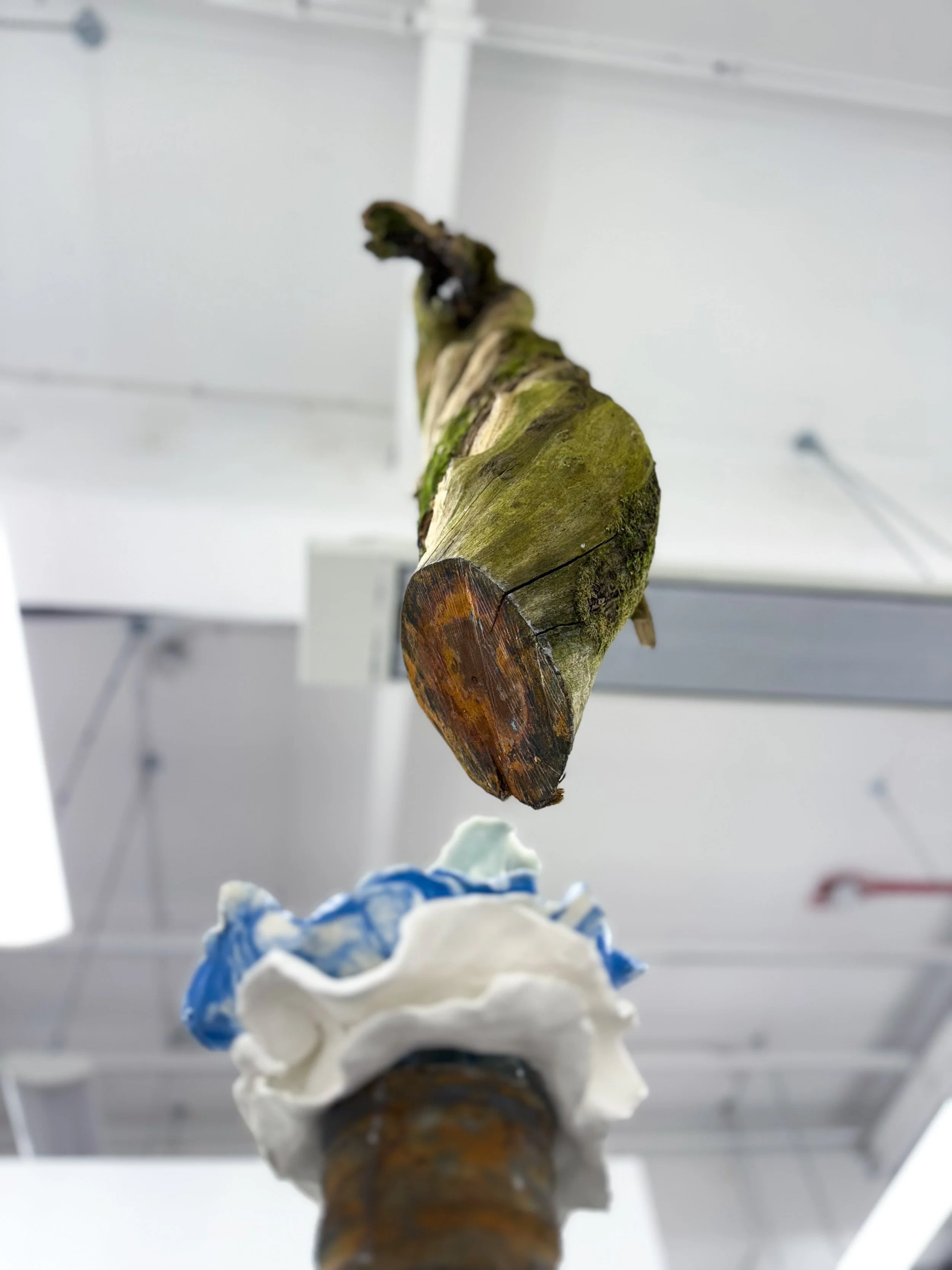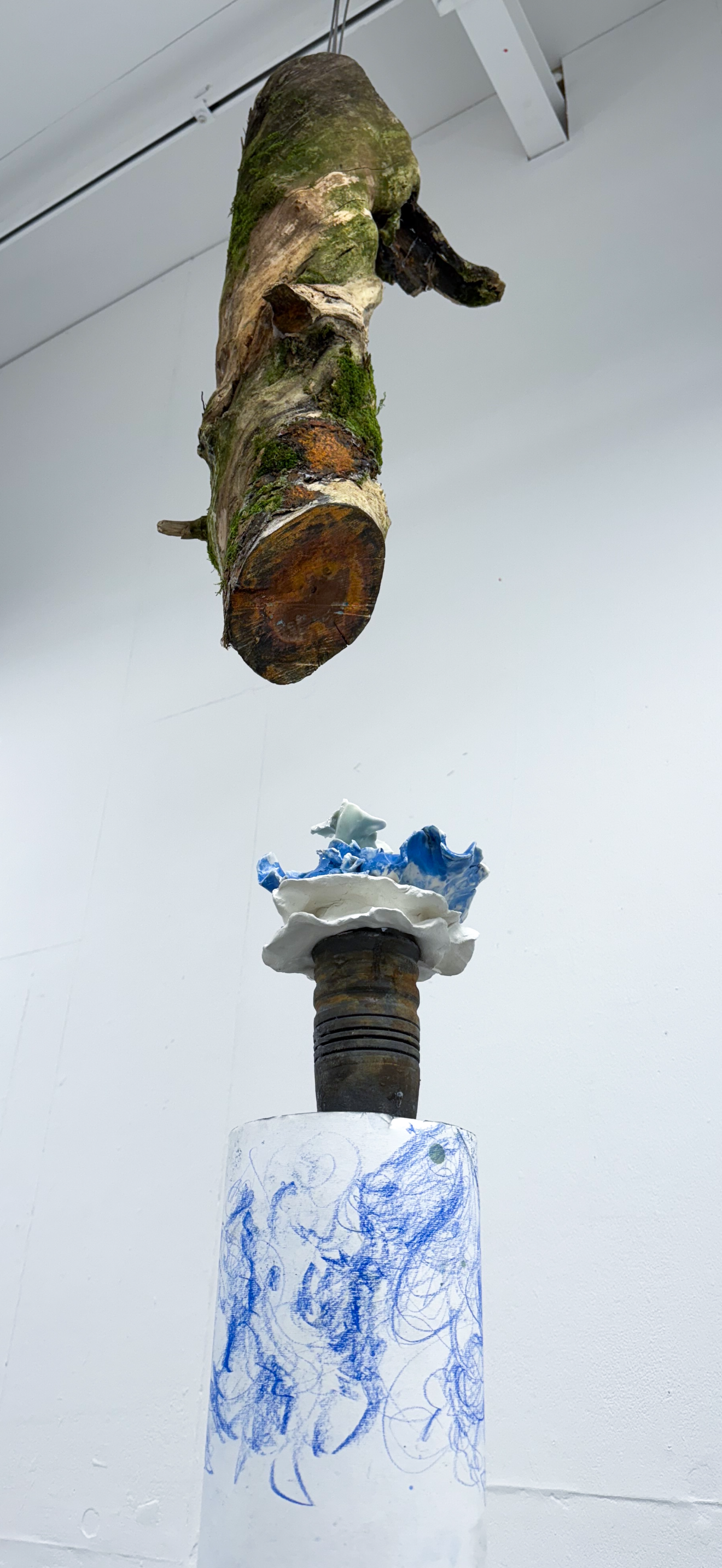 The drawing grows tall, much like the trees did, interconnecting their fragmented existence, held in place by a turned wooden spindle, making reference to historical influences, from antiquity to renaissance to baroque with the flourishes of the elder tree, porcelain and cast pieces on which all balances: emulating the delicate balance between human forms and natural rhythms.