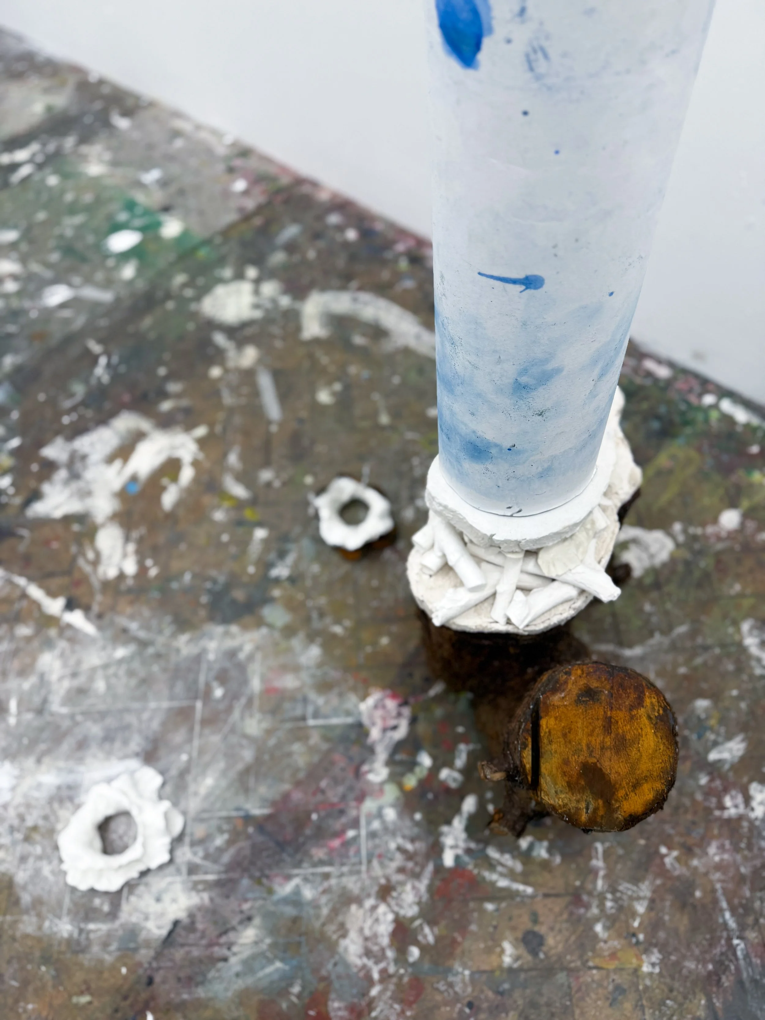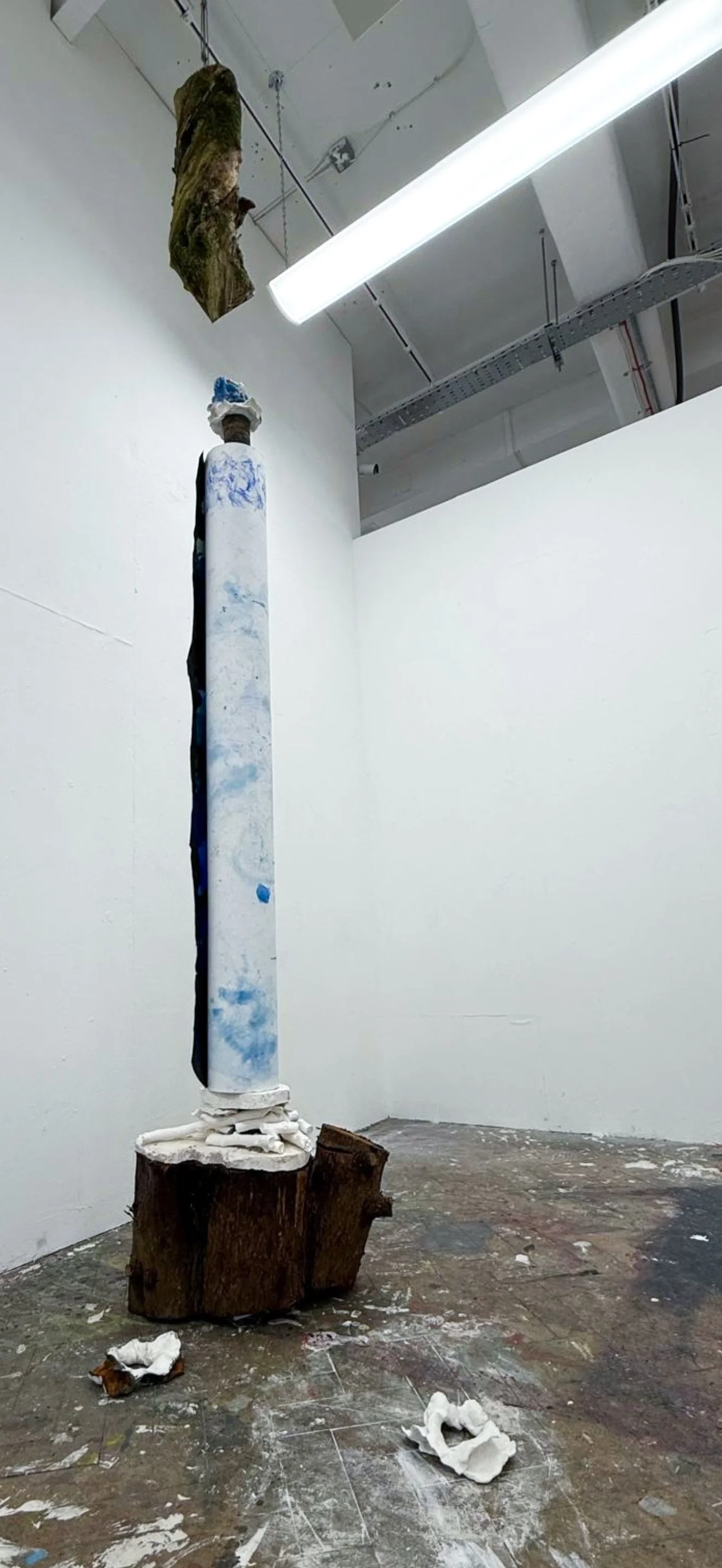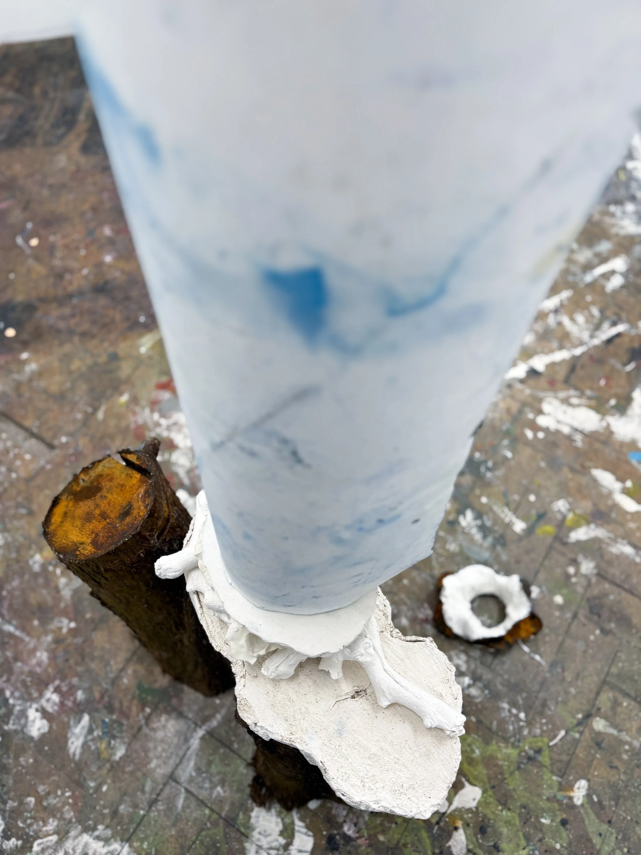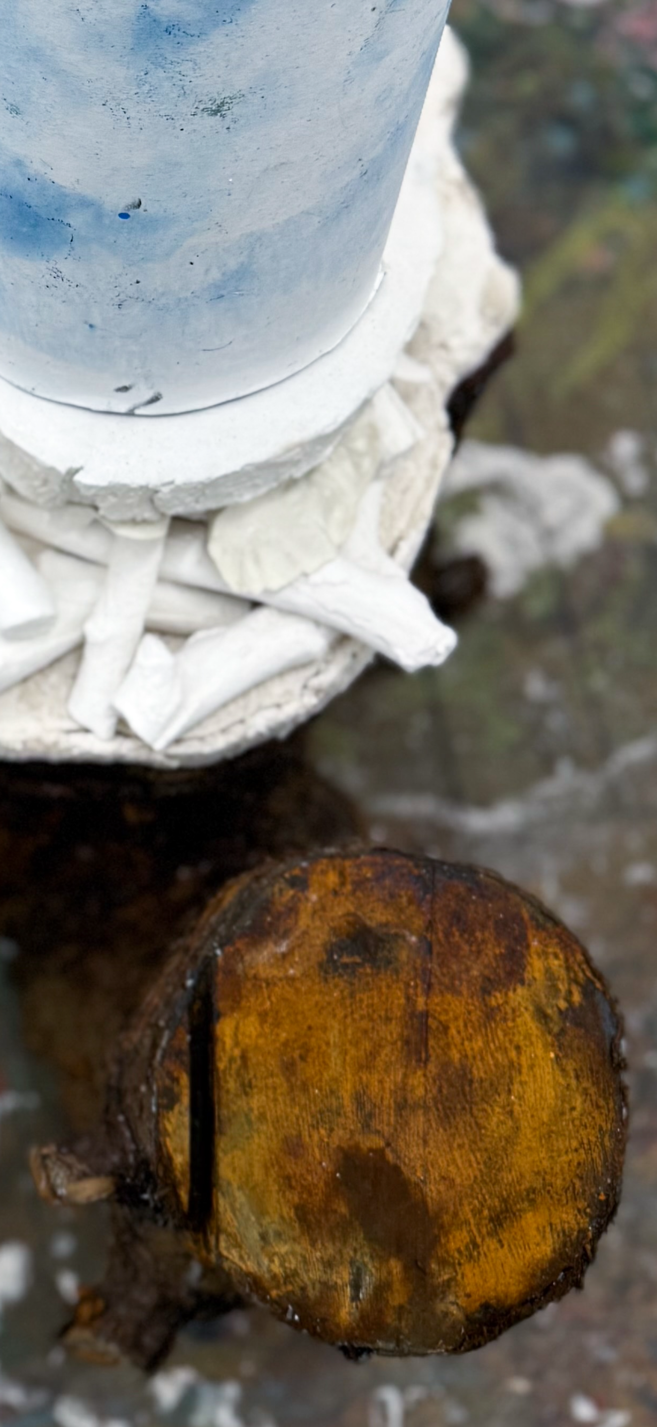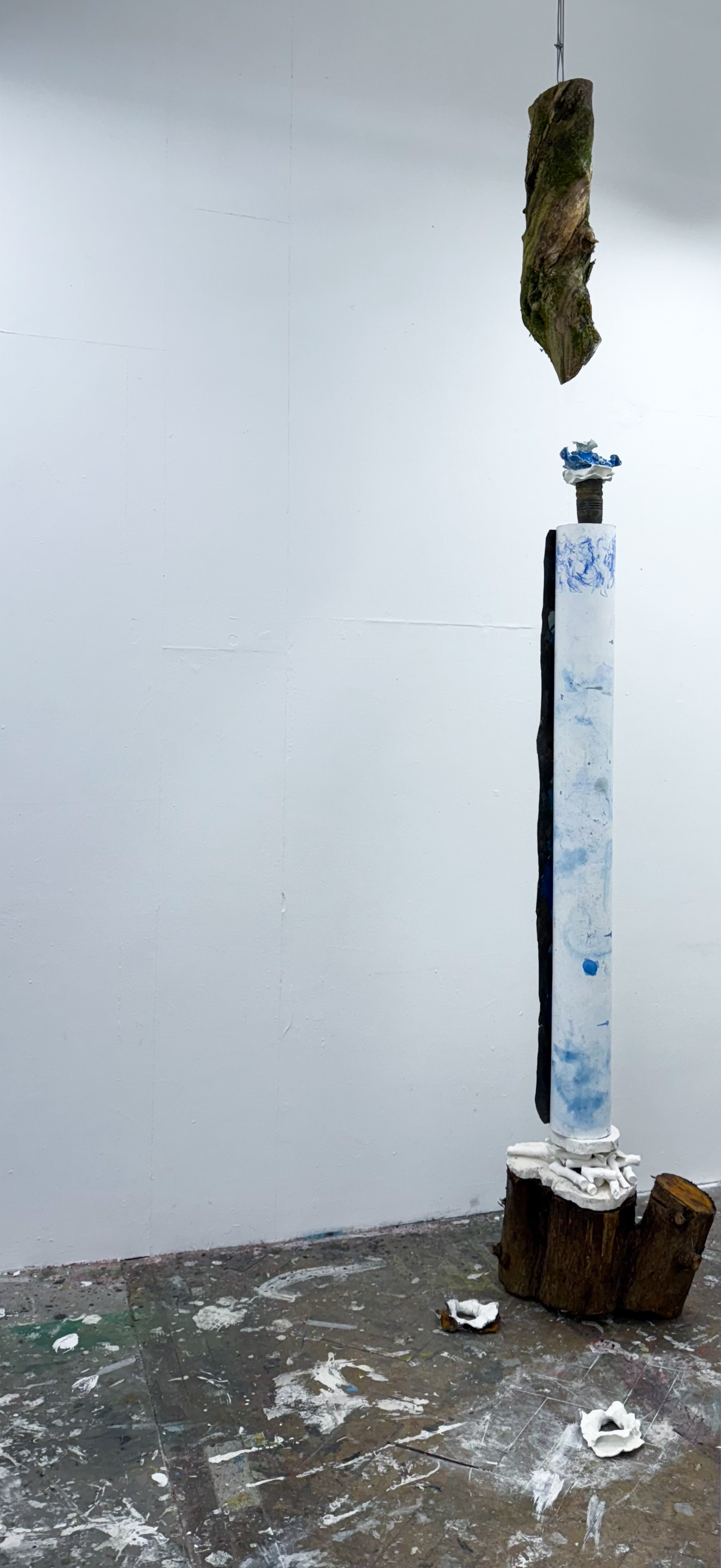 The drawing grows tall, much like the trees did, interconnecting their fragmented existence, held in place by a turned wooden spindle, making reference to historical influences, from antiquity to renaissance to baroque with the flourishes of the elder tree, porcelain and cast pieces on which all balances: emulating the delicate balance between human forms and natural rhythms.